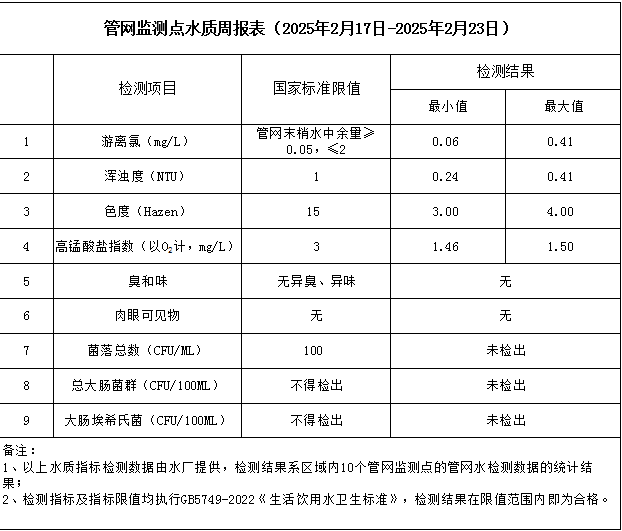 管網(wǎng)監(jiān)測點水質(zhì)周報表(2025年2月17日-2025年2月23日)