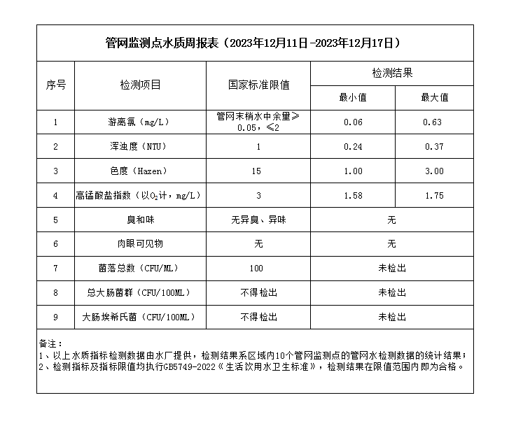 管網(wǎng)監(jiān)測點(diǎn)水質(zhì)周報(bào)表(2023年12月11日-2023年12月17日)