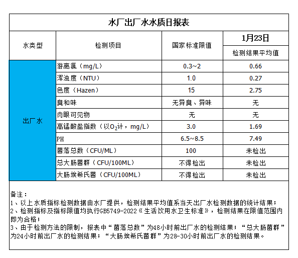 水廠出廠水水質(zhì)日?qǐng)?bào)表(2024-1-23)