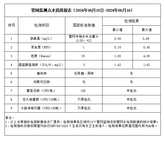 管網(wǎng)監(jiān)測(cè)點(diǎn)水質(zhì)周報(bào)表(2024年06月10日-2024年06月16)